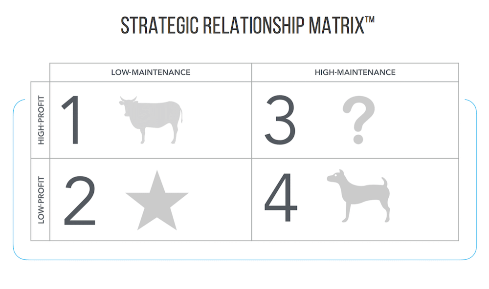 These are the high-profit/high-maintenance relationships. These are probably the most frustrating. They seem too profitable to exit. But they require so much maintenance, you are often left wondering whether it is worth the effort. As a result, they are a perpetual question mark.